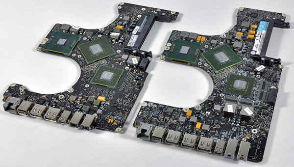 Un interessante confronto tra la scheda logica del MacBook Pro 15" (a sinistra) e quella del MacBook Pro 17", quello con una porta USB in più e con 512 MB di memoria video al posto di 256 MB.