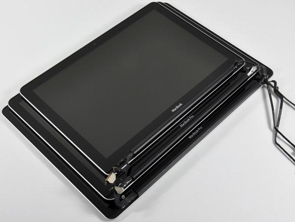 I display lucidi dei tre nuovi modelli di computer portatili di Apple, uno sopra l'altro per vedere le differenze tra il 13,3", il 15,4" ed il 17". Dell'ultimo Apple fornisce anche la versione opaca.