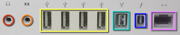 Si tratta di indistinguibili computer desktop rispetto alla precedente generazione, finché non si guarda il retro, dove sono posizionate in modo ordinato ed elegante tutte le porte disponibili. Come abbiamo già notato l’unica differenza è che l’iMac da 21,5 pollici (quello raffigurato in questo caso, il modello “entry level” EMC 2428) dispone di 1 sola Thunderbolt, mentre l’iMac da 27 pollici ne ha addirittura 2 (per pilotare fino ad una coppia di monitor esterni di grande dimensione). Il connettore studiato da Apple ed Intel è indicato con il colore blu nell’immagine sottostante, tutto il resto è rimasto uguale, ovvero 4 porte USB 2, 1 porta FireWire 800, i porta Ethernet gigabit e le doppie porte IN/OUT dell’audio. Sul bordo si trova lo slot per schede SDXC e quello per l’unità ottica CD/DVD.