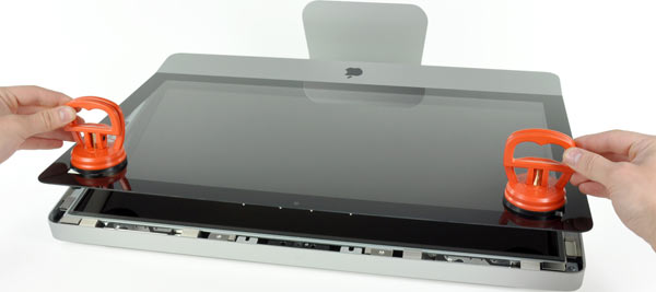 Nessuna novità per cominciare a scrutare l’interno dell’iMac, si apre semplicemente togliendo il vetro dello schermo con semplici ventose.