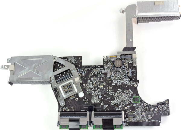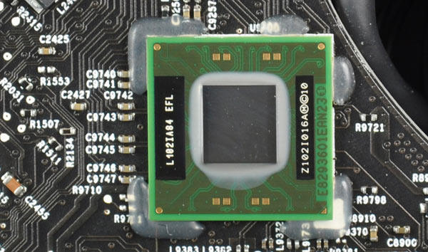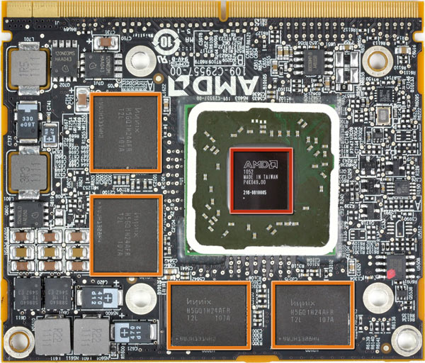 Sotto si trova la GPU Radeon HD 6750M di AMD (ex ATI) circondata dai chip di memoria, in questo caso forniti da Hynix, qui per un totale di 512 MB. La soluzione separata fa intuire l’eventualità di una sostituzione della scheda grafica.