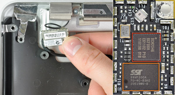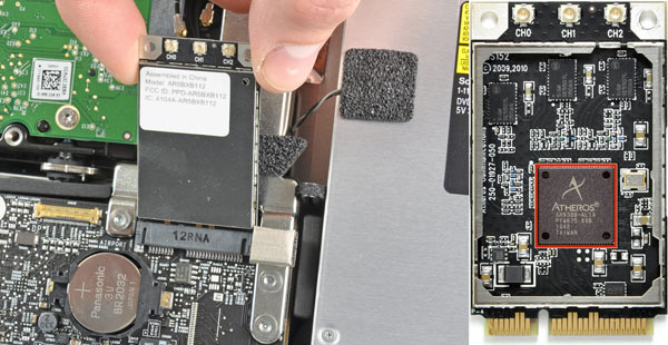 Dopo molti anni Apple abbandona Broadcom per la piccola scheda wireless, qui troviamo Atheros per il Wi-Fi 802.11n. La società è stata recentemente comperata da Qualcomm, fornitore recente di Apple per la tecnologia CDMA, usata nell’iPhone 4 CDMA ed iPad 2 CDMA.