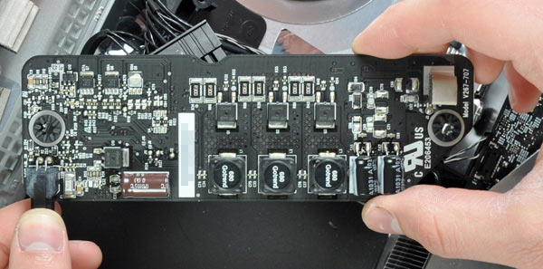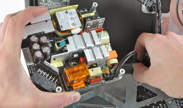 Ecco il corposo trasformatore dell’iMac 21,5″, collegato al resto dell’elettronica con questo grosso cavo.