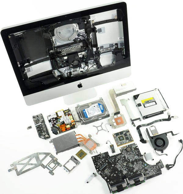 Infine ecco l’esploso dell’iMac con tutte le parti smontate con competenza.