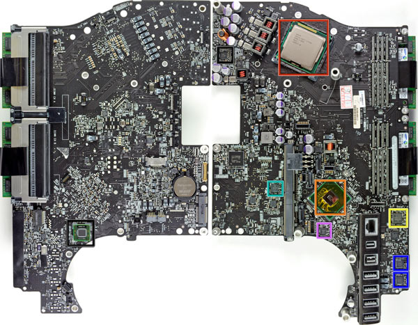 Il fronte/retro della scheda logica “nuda e cruda”. Riquadrato in rosso la CPU di Intel con 6 MB di cache, il controller di Intel è riquadrato in arancione (dovrebbe essere la versione Z68 ancora sconosciuta), in giallo i chip di broadcom per controllo memoria ed Ethernet, il controller audio di Cirrus è in azzurro, i controller USB di SMSC sono in blu, poi chip Intersil in rosa ed il già notato controller della Thunderbolt in nero.