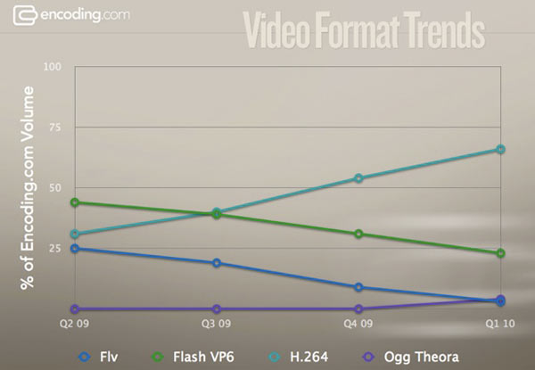 Infine TechCrunch ha chiesto ad Encoding di calcolare i tipi di codifiche impiegate per i video dei suoi clienti (MTV Networks, WebMD, Brightcove, Nokia, MySpace e Red Bull) nell’ultimo anno. H.264 è oggi la codifica più popolare avendo più che raddoppiato la percentuale negli ultimi 12 mesi e raggiungendo il 66%. Flash con VP6 arriva al 23% e le briciole le raccolgono Ogg Theora (4%) e FLV (3%), il container di Flash codificato H.263.