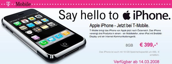 In serata è arrivata la poco anticipata ufficializzazione di quanto dichiarato in febbraio: T-Mobile Austria venderà l'iPhone a partire dal 14 marzo. Un mese fa il CEO Hamid Akhavan lo aveva preannunciato a Barcellona.