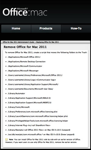 Aggiornamento del 16/01/2011: grazie al lettore onlyvitix (e non a Microsoft Italia) che ce lo segnala via Twitter, Microsoft avrebbe postato online una complessa procedura per rimuovere, uno ad uno tutti gli elementi installati da Office 2011 sul Mac. Bene, ma siamo alle solite, manca una sorta di script che faccia tutto per rendere la vita semplice agli utenti.