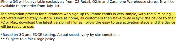 Una per le funzioni telefoniche con il carrier scelto, l'altra via iTunes dal proprio PC per l'abilitazione dei servizi di App Store, usando l'account del negozio multimediale. O2 Irlanda conferma. Aggiornato.