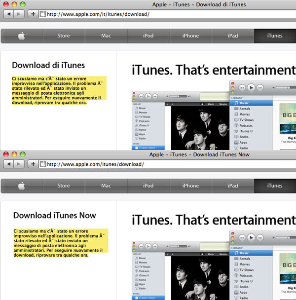 Solo da poco è tornato possibile scaricare iTunes dal sito di Apple, per svariate ore (come minimo tutto il pomeriggio) gli utenti ricevevano errore.