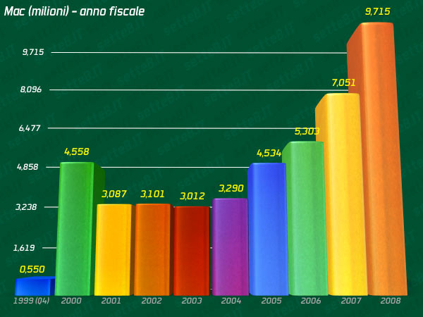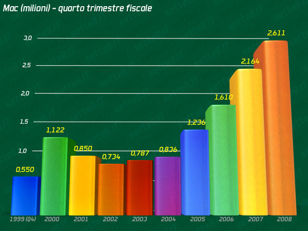 In base ai dati pubblicati possiamo mostrarvi come sono aumentate le vendite dei Mac negli ultimi dieci anni. La tabella sottostante riguarda il confronto dei vari ultimi trimestri degli anni dal 1999 al 2008.