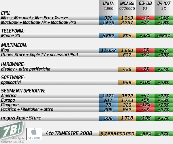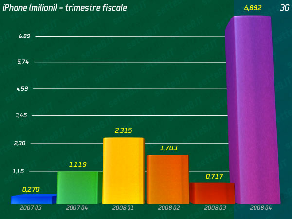 Il secondo miglior trimestre di sempre per Apple e comunque mai un quarto periodo dell'anno è stato così buono. Sono stati venduti 6,9 milioni di iPhone 3G e 2,6 milioni di Mac, record assoluto.