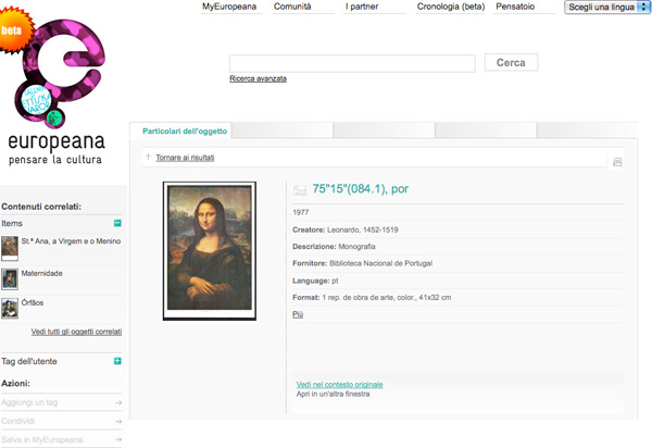 Si trovano ancora un numero limitato di opere di vario tipo (quadri, fotografie, video, libri, giornali, manoscritti, mappe, registrazioni sonore, oggetti dei musei, etc), solo l'1% del patrimonio culturale europeo, ma almeno il quadro più famoso del mondo c'è grazie ad un museo portoghese, ecco la "Gioconda" di Leonardo nella prima ricerca che abbiamo effettuato pochi istanti fa.