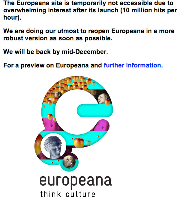 Aggiornamento del 21/11/2008: a giudicare dall'inizio le cose per Europeana sono cominciate molto male. La struttura non ha retto (10 milioni di hit all'ora) ed i responsabili del sito hanno deciso di scollegare tutto per tornare a metà dicembre con server più robusti.