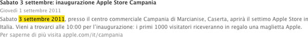 Dopo un curioso tira e molla, è finalmente arrivata a tarda notte la conferma ufficiale di quello che vi avevamo raccontato lunedì sera: l’Apple Store di Marcianise (in località Aurno, provincia di Caserta) aprirà sabato prossimo 3 settembre alle ore 10.