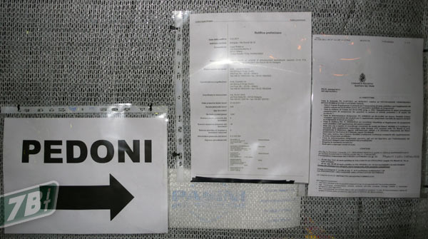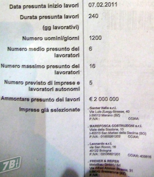 Aggiornamento del 12/02/2011: ecco il cartello riveduto e corretto (senza la data di completamento) con tutti i lavori coinvolti, rimosso da sopra l’ingresso ed appeso sulla rete esterna.