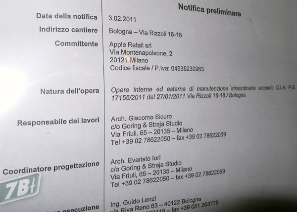 Nella giornata di oggi è apparsa la dichiarazione dell’inizio delle operazioni. Il committente è Apple Retail (con sede autonoma in via Montenapoleone a Milano, prima era presso uno studio notarile). La visione d’insieme è sicuramente made in USA, ma il responsabile dei lavori è uno studio d’architettura di Milano, mentre l’esecuzione è affidata ad un ingegnere bolognese.