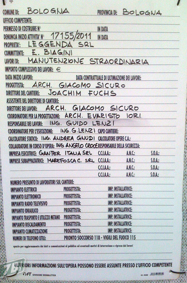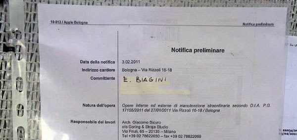 Aggiornamento del 12/02/2011: ricambiamo volentieri lo scambio di link con Tevac, che ci fornisce il seguito della storia di questi cartelli. Deve essere intervenuta la pastoia burocratica di Apple Italia per impedire di far sapere ai passanti che in quel posto aprirà un Apple Store, infatti un miracoloso sbianchetto e pennarello ci dicono che il “nuovo” committente è un tale chiamato “E. Biagini”. Che sia il country manager di Apple Italia Enzo Biagini? Nome già apparso sui cartelli di Grugliasco (TO) ed Orio al Serio (BG), durante la ristrutturazione di quelli che sono poi diventati Apple Store. Appena smettiamo di ridere possiamo cominciare a chiederci se è possibile cambiare il committente tanto facilmente su un documento ufficiale da esporre al pubblico.