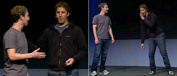 Proprio del 14esimo uomo più ricco d’America o del POY – Person of the Year di Time non si trattava, però. Infatti sul palco è salito in ciabatte l’attore Andy Samberg ed ha iniziato lui il discorso introduttivo dell’evento, mimando in tutto e per tutto il CEO di Facebook. Si vede che Jesse Eisenberg (protagonista del film “The social network”) era impegnato. Qui il video.