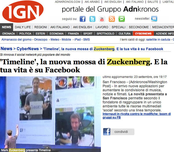 Aggiornamento del 24/09/2011: chi glielo spiega all’agenzia stampa Adnkronos che il CEO di Facebook non si chiama così?