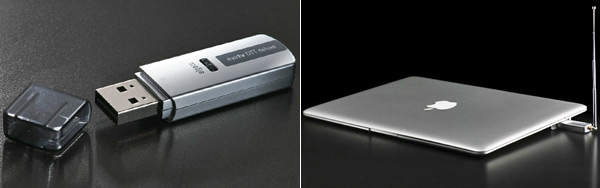 L'EyeTV DTT Deluxe è pensato soprattutto per l'utilizzo on the road, non a caso il produttore mostra il sintonizzatore collegato al MacBook Air. Segno che lo spazio per collegare questo tuner è adeguato anche sul sottile laptop di Apple.