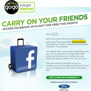 USA Today anticipa che su quasi tutto il migliaio di aerei nordamericani abilitati al collegamento ad Internet di Aircell, denominato Gogo, sarà fornito l’accesso gratuito a Facebook per il mese in corso.