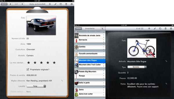Sono compresi i temi di sfondo con font coordinati, disegnati appositamente per l’iPad. La versione di questo software della succursale di Apple per iPad comprende 25 modelli di database predefiniti, pronti per l’uso o da personalizzare.