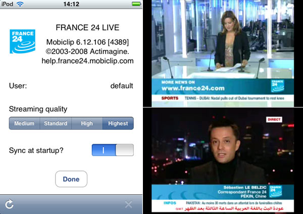 La TV in diretta è arrivata nell'iPhone/iPod touch grazie al sistema di codifica Mobiclip di Actimage. Il primato è di France 24.