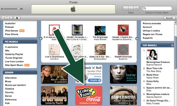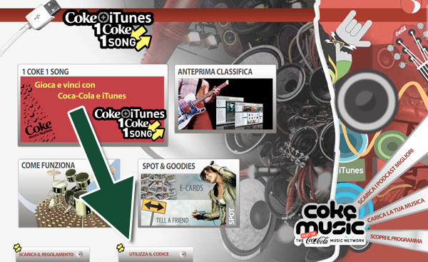 Alternativamente potete andare sul sito di Coca-Cola Italia e cliccare la sezione "1 Coke/1 Song" e poi su "utilizza il codice", sarete re-indirizzati esattamente sulla pagina di iTunes Store Italia per inserire il codice.