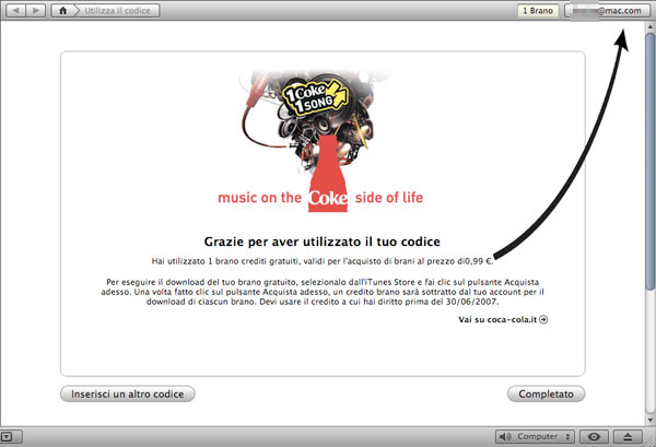 Una volta fatta questa operazione arriverà la conferma dell'accredito di 1 buono per scaricare una qualunque canzone da 0,99 centesimi di euro da iTunes Store. Potete recarvi subito sulla home page di iTunes Store Italia e procedere al download oppure tenere il buono e usufruirne entro il 30 giugno.
