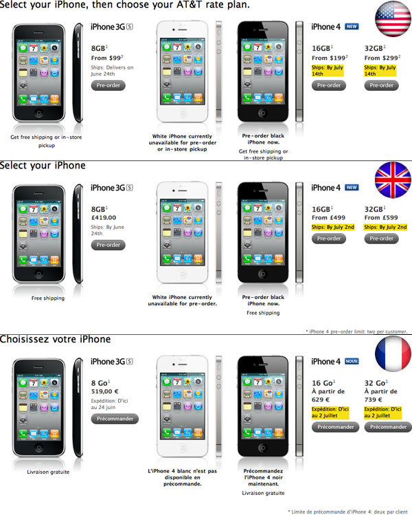 Questa sera solo l’Apple Store USA indica il passaggio dal 2 al 14 luglio per le consegne di iPhone 4, quelli britannico e francese sono “fermi” ancora al 2 luglio. Forse per la poca cura precedentemente ricordata, può essere che nelle prossime ore si accorgano a Cupertino di avere l’incombenza anche di altri paesi ed aggiornino alla nuova data i restanti negozi online.