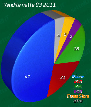 Il 96% delle vendite nette di Apple è costituito dai 4 principali hardware e servizi correlati, più la musica/video di iTunes Store. Gli iPhone valgono il 47% del totale del trimestre, gli iPad il 21%, i Mac il 18%, gli iPod il 5% ed un altro 5% per il negozio multimediale.