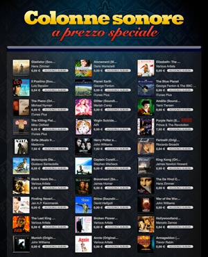 Con un salto alla versione italiana di iTunes Store possiamo notare la nuova sezione delle Colonne sonore a prezzo speciale, attualmente costituito da una trentina di album che hanno accompagnato pellicole famose. Ci sono raccolte musicali che costano anche solo 6 euro.