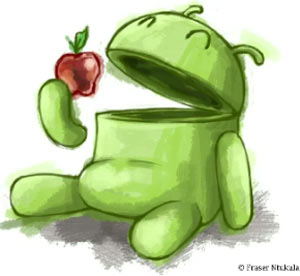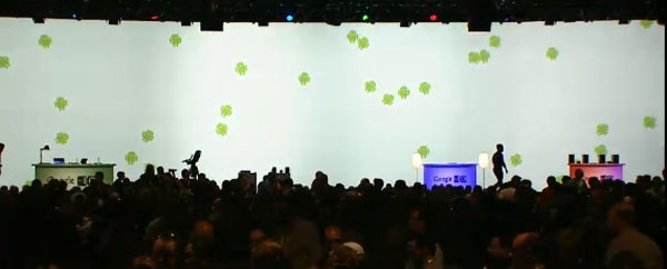 Android è al centro dell’attenzione. Con 310 dispositivi sfornati da 36 produttori di hardware su 215 carrier in 112 paesi ed 8 versioni del sistema operativo, il prossimo si chiamerà “Ice Cream Sandwich”. Google si bea di un successo che porterà a papparsi la mela di Apple, come mostrato in questa immagine artistica che ha procurato molto divertimento nel salone del Moscone Center West.