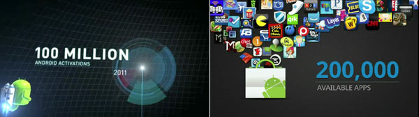 Copiando l’immagine delle icone che si vanno vorticosamente ad infilare nello stesso posto, Google ha mostrato i grandi numeri di Android: finora si contano 100 milioni di dispositivi attivati con questo OS, una media di 400.000 nuovi ogni giorno per l’avventura iniziata nel settembre 2008. Per quel che riguarda le applicazioni, stanno crescendo, non hanno ancora superato le 350.000 disponibili su App Store per i dispositivi iOS, ma 200.000 è un numero destinato ad aumentare rapidamente. Google ha calcolato 4,5 miliardi di download, mentre sappiamo bene che in gennaio Apple ha festeggiato i 10 miliardi.