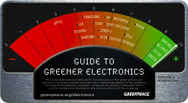 A fine agosto, con l'occasione della pubblicazione della prima "Guide to Greener Electronics" (484 KB), Apple si classificava 11esima tra i 14 marchi tecnologici presi in esame da Greenpeace.