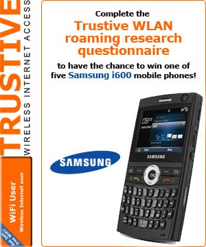 Vi basterà cliccare sul banner di color arancio "WiFi User". Rispondere alle 37 domande (in inglese) non solo Trustive vi invierà via email un codice per accedere alle reti Wi-Fi presenti in tutto il mondo, vi farà anche partecipare ad un concorso che regala cinque smartphone Samsung i600 (con sistema operativo Win Mobile).