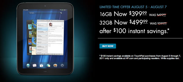 Solo per lo scorso weekend il listino è stato ribassato di 100 dollari, mostrando quindi prezzi di 400 e 500 dollari in USA. La promozione non ha riguardato altri paesi come Canada, Francia, Germania, Gran Bretagna ed Irlanda (dove è in vendita attualmente), in Australia, Hong Kong, Italia, Nuova Zelanda, Singapore e Spagna questo tablet arriverà entro l’anno a 470 e 580 euro (così HP Italia diceva il 10 giugno).