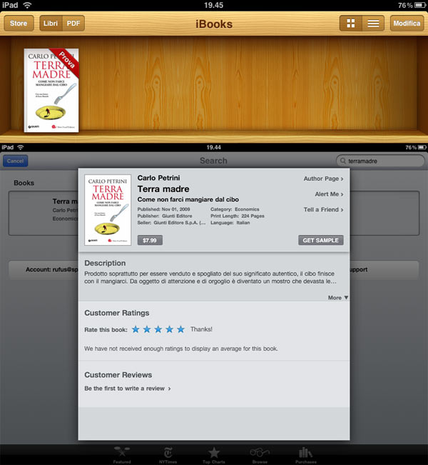 Tra i titoli portati da Giunti in iBookstore spicca “Terra madre” di Carlo Petrini. Il catalogo comprenderà anche libri illustrati, manuali, guide, repertori e, in particolare, libri per ragazzi.