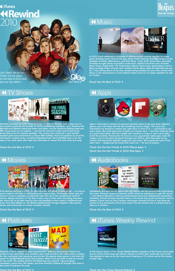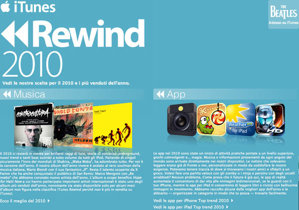 Aggiornamento del 09/12/2010: è finalmente comparsa la sezione Rewind 2010 su iTunes Store con il riassunto di tutti i campioni di vendita già anticipati. “Angry birds” è l’applicazione a pagamento più scaricata in versione iPhone/iPod touch mentre per iPad è “Pages” di Apple. Quella gratuita più popolare sia per iPhone/iPod touch che per iPad è “iBooks”. Gli audiolibri più acquistati sono stati “The girl with the dragon tattoo” di Stieg Larsson e “The art of war” di Sun Tzu.