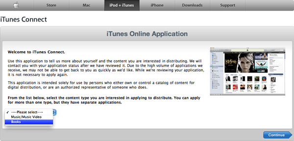 La pagina di iTunes Connect non mostra solo l’opzione per distribuire canzoni e videoclip ma pure i libri. Il documento da inviare ad Apple dovrà essere in formato ePub (EpubCheck 1.0.5) e corredato da un numero a 13 cifre ISBN che lo identifichi in modo assoluto.