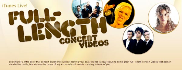 Chi ama le esibizioni dal vivo dei cantanti/gruppi più in voga sarà felice di sapere che su iTunes Store USA è nata la nuova sezione iTunes Live! Full-length concert video. Sono registrazioni video dei concerti vendute a prezzi assolutamente variabili e con modalità d’acquisto diverse (a singole canzoni oppure a concerto intero).
