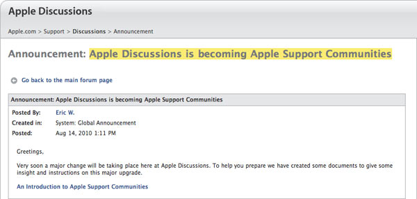 Eric W. ci annuncia che presto il forum delle discussioni di Apple cambierà da Apple Discussions ad Apple Support Communities, quando non si sa con esattezza.