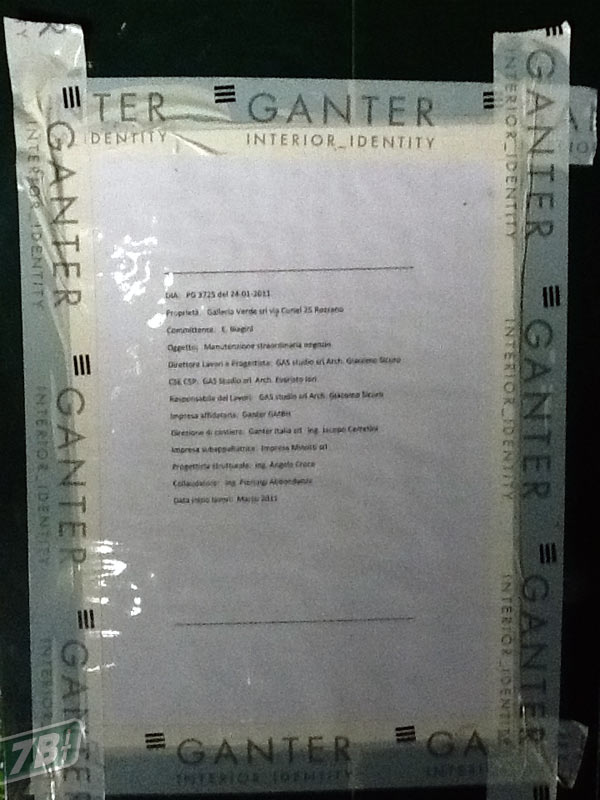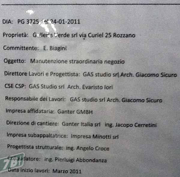 Qui si può leggere di tutto ma non la data di durata dei lavori, che tanto in Italia non indica nessuno. Come vedete il committente è il solito “E. Biagini” (nemmeno gli concedono di scrivere interamente il nome di battesimo, tutta la nostra solidarietà). Come a Bologna ed Orio al Serio l’impresa esecutrice è la tedesca Ganter, con immancabile subappalto.