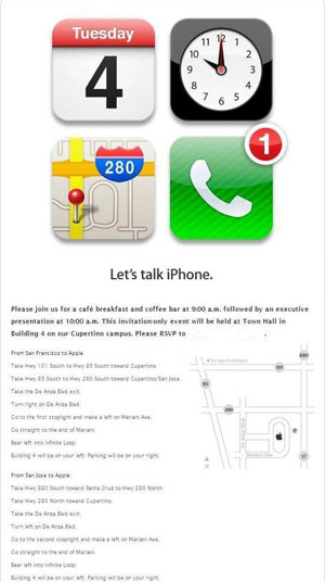 Apple, in questa occasione, ha scelto di fare la presentazione per la stampa USA nel proprio Town Hall Meeting al 4 di Infinite loop, presso il campus di Cupertino (altro che Yerba Buena Center for the Arts di San Francisco, che qualcuno, facendo finta di saperla lunga, dava per certo sulle testate principali italiane), che ha solo al massimo 250 posti. Al momento non è confermato uno streaming in diretta della presentazione (buona abitudine nata 13 mesi prima), per renderla accessibile a tutti. Speriamo vivamente che accada.