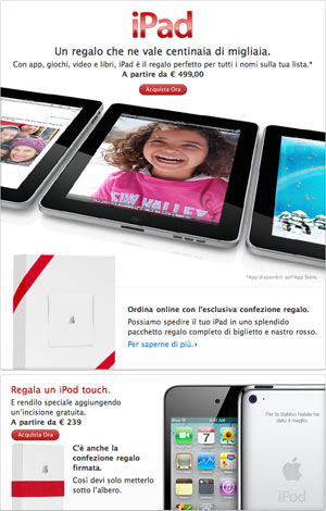Si avvicinano le festività commerciali di fine anno e l’Apple Store propone i pacchi regalo per diverse tipologie di prodotti Apple. Tra questi c’è l’iPad, tutto infiocchettato con un bel nastro rosso.