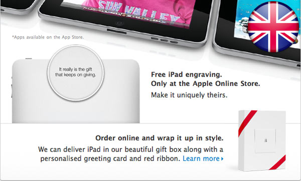 Altrove (per esempio in Gran Bretagna, come si vede qui sotto), la stessa home page dell’Apple Store indica chiaramente che l’incisione dell’iPad è disponibile. Da noi e dai confinanti di Austria e Svizzera questa grafica non c’è, perciò non si tratta di un errore.