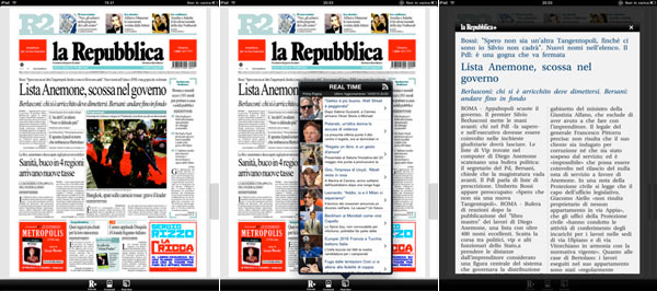 Nel weekend il concorrente de la Repubblica è arrivato su App Store con “la Repubblica +“, un software per ora gratuito che rende il giornale (ed i suoi allegati settimanali) leggibile in un PDF, poco più arricchito con gli update del sito. Veramente un valore aggiunto minimo rispetto al quotidiano cartaceo, che almeno ha le colonne dei testi giustificate.