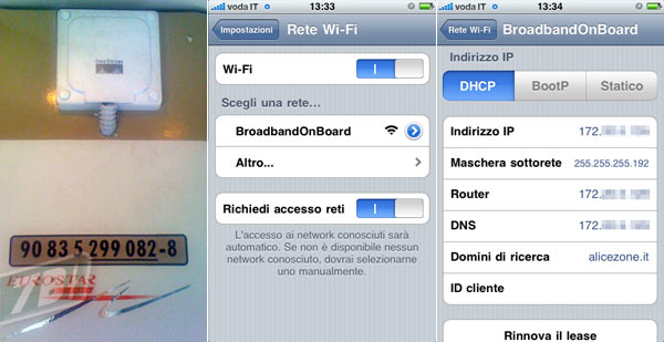 Grazie al nostro affezionato lettore Carlo possiamo mostrarvi l’immagine di uno dei router visibili in cabina (di Cisco) e delle schermate su iPhone, per come si presenta la rete “BroadbandOnBoard”, con tanto di identificazione Alice Zone.