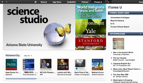 Era la fine di maggio del 2007 quando Apple inventava iTunes U assieme alle università più prestigiose come Stanford, Berkeley, Duke University e MIT. Oltre 800 università di tutto il mondo (l’approccio di quelle italiane è più timido), con le nuove aggiunte di Cina, Giappone, Hong Kong, Messico e Singapore, propongono 350.000 podcast audio e video da scaricare per imparare qualcosa di nuovo.